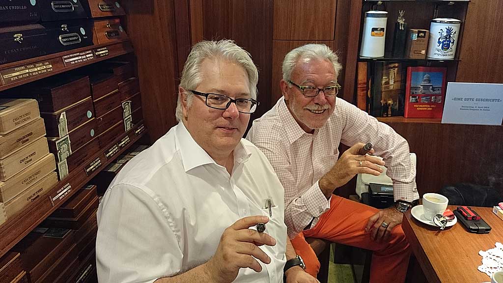 Ich fand mich vor dem Anlass, mit meiner Freundin, in Urs Portmanns Zigarrengeschäft in Kreuzlingen, ein. Dort traf ich zum ersten mal Nino Munoz, den weltbekannten Aficionado. Er betreibt mit Flyingcigar eines der besten Blogs weltweit. Gestartet habe ich mit einer Cohiba Siglo I, die er mir gegeben hat. Danach genoss ich eine hervorragende Cohiba Lancero von ihm. Zu guter letzt hat er mir eine Partagas Lusitanias Gran Reserva mit einer speziellen Nino Munoz Anilla überlassen. Nino ist ein wirklicher Zigarren-Geniesser mit grosser Fachkenntnis und einem unschlagbaren Netzwerk in die Zigarrenwelt. Zudem ist er ein hervorragender Gesprächspartner, der schon sehr viel erlebt hat, sei es auf seinen Reisen, als Purser bei Lufthansa und als vielgereister in Sachen Zigarren.