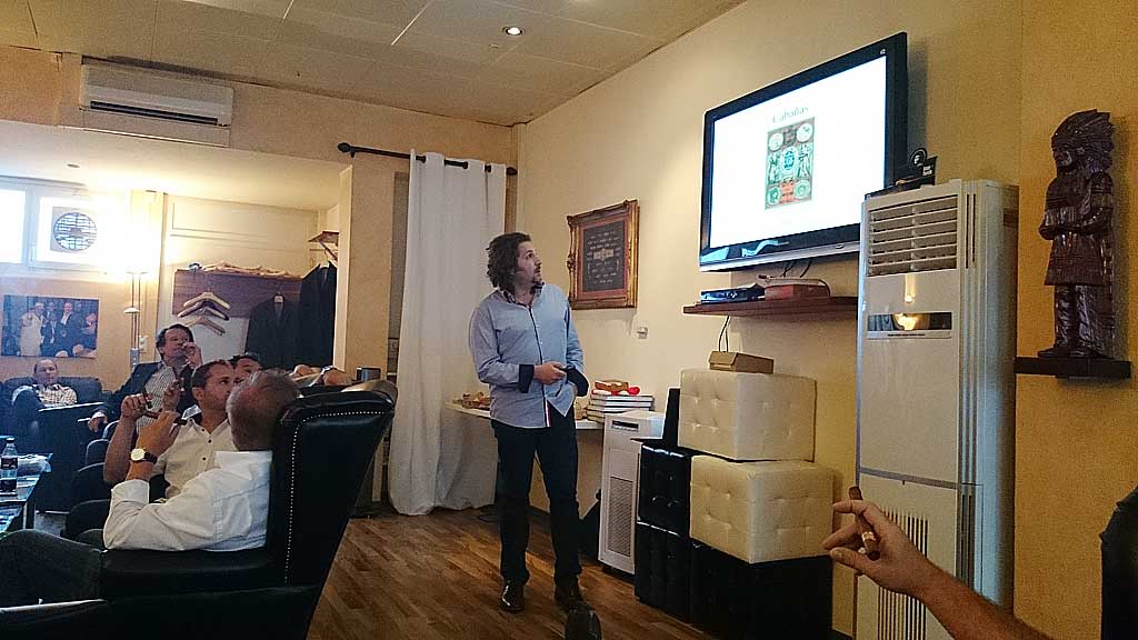 Urs bekam sehr viel Lob und einige Geschenke. Die absolte Überraschung war von Nino. Dank seinem guten Kontakt zu Min Ron Nee, aka Dr. Nip, wurde Urs mit zwei Ausgaben des neuen Buches, der zweiten Ausgabe 2014 “An Illustrated Encyclopedia of Post-Revolution Havana Cigars”, beschenkt. Das ist kein normales Buch, sondern sind sechs Bücher in einem grossen Bambusgehäuse. Alles zusammen wiegt gut 100kg! Mehr Informationen darüber auf Nino’s Blog. Von dieser Enzyklopädie wird es weltweit nur 2000 Stück geben. Urs hat die Nummern 0009 signiert und 0109 unsigniert bekommen. Der Höhepunkt war zudem, Dr. Nip hat höchstpersönlich angerufen und ihm gratuliert, sowie sich für Urs’ Mithilfe, durch die Gabe von sehr seltenen Zigarren bedankt – unglaublich!. Alle Anwesenden konnten dies live mitverfolgen, da das Gespräch übertragen wurde. Nino, die Überraschung ist dir aber zu 100% gelungen!