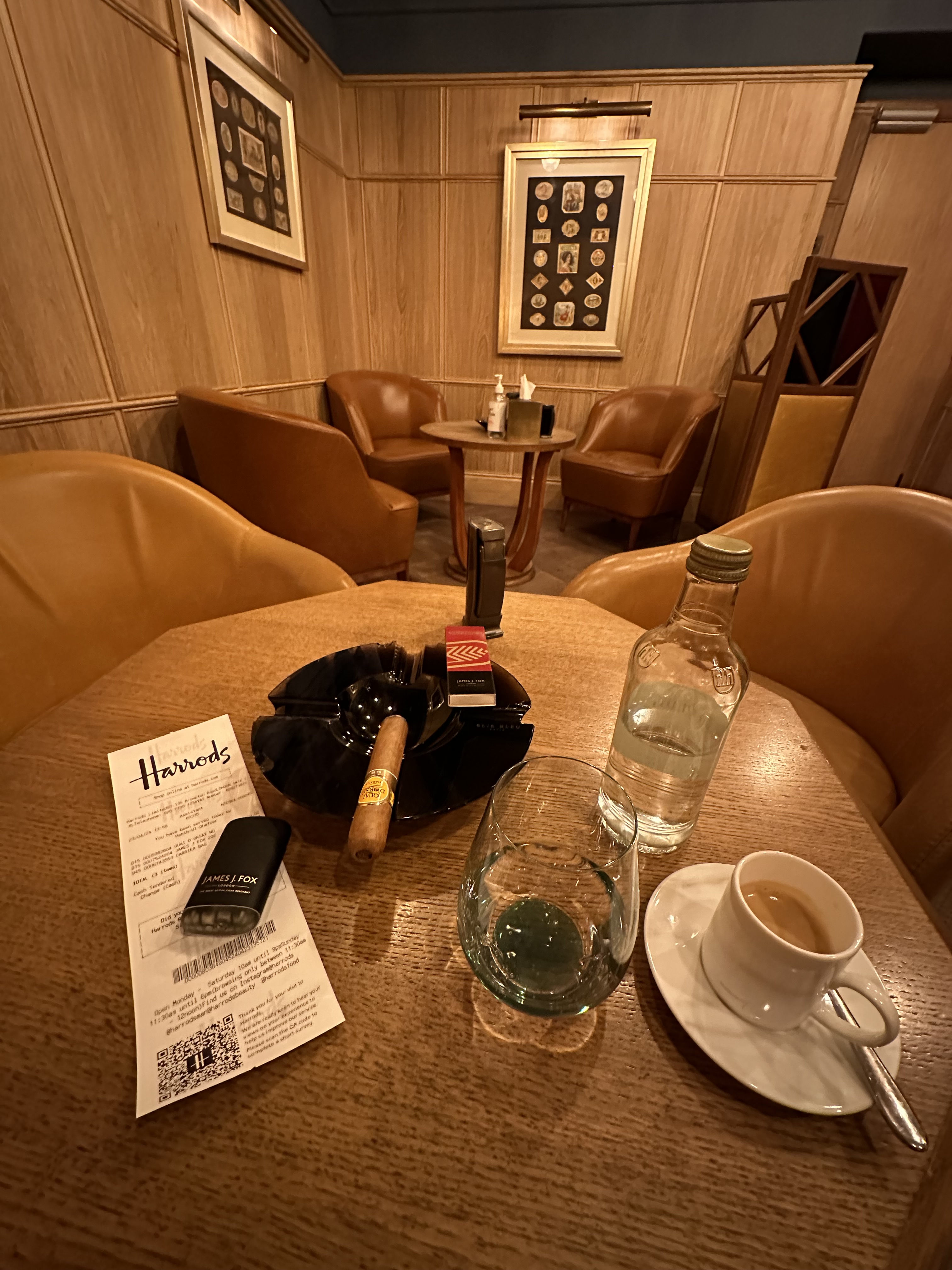 In the J.J. Fox cigar shop & lounge at Harrods department store.